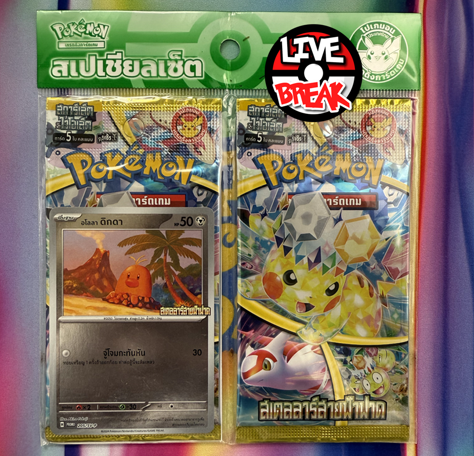Diese exotischen Promo Blister aus Thailand hast du noch nicht gesehen! Neben zwei Boostern aus der Erweiterung Stürmische Funken gibt es eine von drei exklusiven Promo holo reversed Karten mit Stamp: Togepi, Krokel oder Digda.